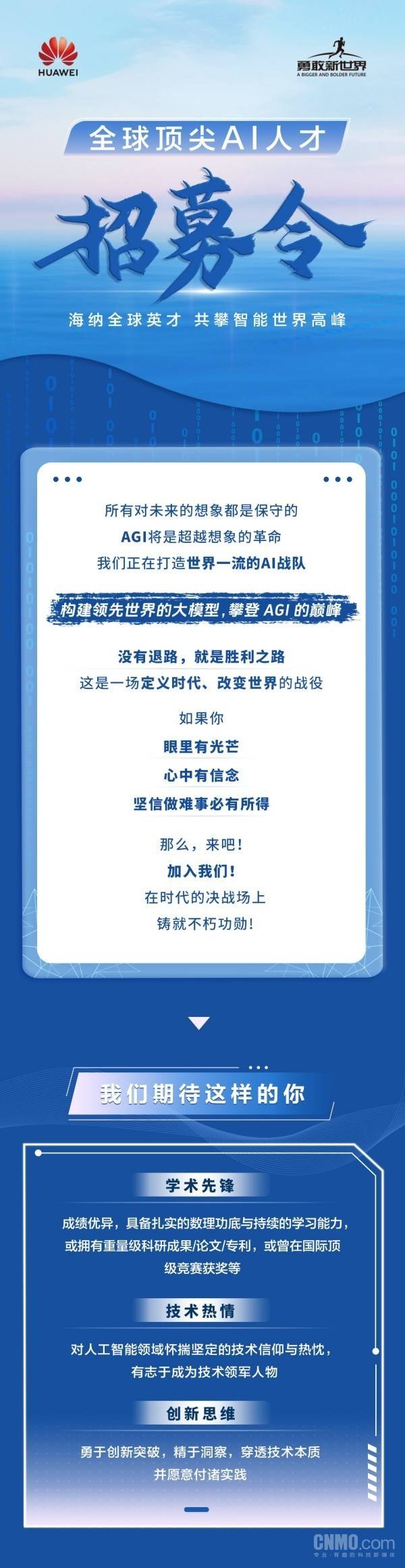 【CNMO科技消息】12月9日,据《科创板日报》报道,华为2012实验室已经成立基础大模型部,专注 于推进基座模型开发。 据CNMO了解,华为2012实验室的名字来源于华为创始人任正非观看完《2012》电影后,认为未来数字 世界的信息爆炸会像电影中末日的洪水一样,华为要想在未来生存就得构造属于自己的"诺亚方舟"。于 是,由数十个研究室组成的2012实验室承载了通信技术、云计算、音频视频分析、人工智能、机器学习 等最前沿技术,主要面向未来5-10年的研究方向。 今年10月,华为常务董事、产品投资委员会主任、终端BG董事长余承东在社交媒体发布"全球顶尖AI人 才招募令",面向全球招募具备卓越学术背景和创新精神的年轻科研人才,拥有原创性科研成果的候选 人将被优先考虑。 所有对未来的想象都是保守的 AGI将是超越想象的革命 我们正在打造世界一流的Al战队 构建领先世界的大模型,攀登 AGI 的巅峰 没有退路,就是胜利之路 这是一场定义时代、改变世界的战役 如果你 眼里有光芒 心中有信念 坚信做难事必有所得 那么,来吧! 加入我们! 在时代的决战场上 铸就不朽功勋! 践们期待这样的你 学术先锋 岗位覆盖AI算法、大模型 ...