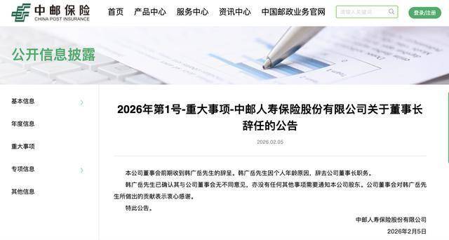 中邮人寿表示,公司董事会对韩广岳所做出的贡献表示衷心感谢。 公开资料显示,韩广岳出生于1966年4月,将在两个月后年满60周岁。他毕业于北京邮电学院管理工程 专业,取得美国加州阿姆斯壮大学工商管理硕士学位。 瑞财经 吴文婷2月5日,中邮人寿保险股份有限公司(以下简称"中邮人寿")发布公告称,公司董事会 前期收到韩广岳的辞呈。韩广岳因个人年龄原因,辞去公司董事长职务。 韩广岳长期任职于中国邮政系统。他于2007年12月任山东省邮政公司党组成员、中国邮政储蓄银行山东 省分行行长;2013年4月起先后任四川省邮政公司总经理、党组副书记、党组书记;2014年9月任中国邮 政集团公司战略规划部(法律事务部)总经理,2015年5月起同时任中邮资本管理有限公司执行董事; 2017年6月任中国邮政集团公司山东省分公司党组书记、副总经理;2019年7月任中国邮政集团公司山东 省分公司总经理、党组书记。 2022年2月,韩广岳出任中邮人寿党委书记,并于当年6月获批出任该公司董事长。除此之外,他还兼任 中国保险学会理事会理事,中国保险行业协会理事会理事,中国互联网投资基金理事会理事,中邮保险 资产管理有限公司党委书记、董事长。 而 ...