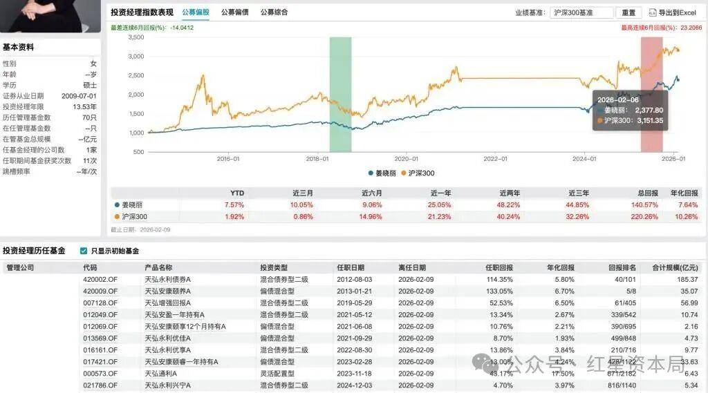 2月9日,天弘基金发布公告称,旗下知名"固收+"基金经理姜晓丽因个人原因,正式卸任其管理的全部 10只公募基金产品。据悉,姜晓丽已向公司提交离职申请,且已在中国证券投资基金业协会完成相关注 销手续。此次其离任的产品涵盖 "固收 +" 及纯债类,包括天弘永利债券、天弘增强回报债券、天弘安 康颐养混合等,合计管理规模达350.24亿元。 在天弘基金微信公众号同步发布的《致天弘固收+投资者的一封信》中,姜晓丽对其离职原因作出说 明,称此次离职是长期高强度工作后希望休息、陪伴家人的个人选择,希望能调整自己的状态,以更好 的状态迎接下一个人生阶段。 任职超13年,代表产品长期回报稳健 作为业内为数不多的女性"固收+"领军人物,姜晓丽拥有超16年证券从业经验和超13年基金管理经验, 其职业轨迹颇具代表性。公开资料显示,2009年7月至2011年2月,她曾在天弘基金担任债券研究员和债 券交易员;2011年3月至2011年7月,于光大永明人寿保险有限公司担任债券交易员兼研究员;2011年8 月姜晓丽回归天弘基金,2012年8月起出任基金经理,后续逐步晋升至固定收益业务总监,兼任固定收 益部、混合资产部总经理,是天弘基金自主培 ...