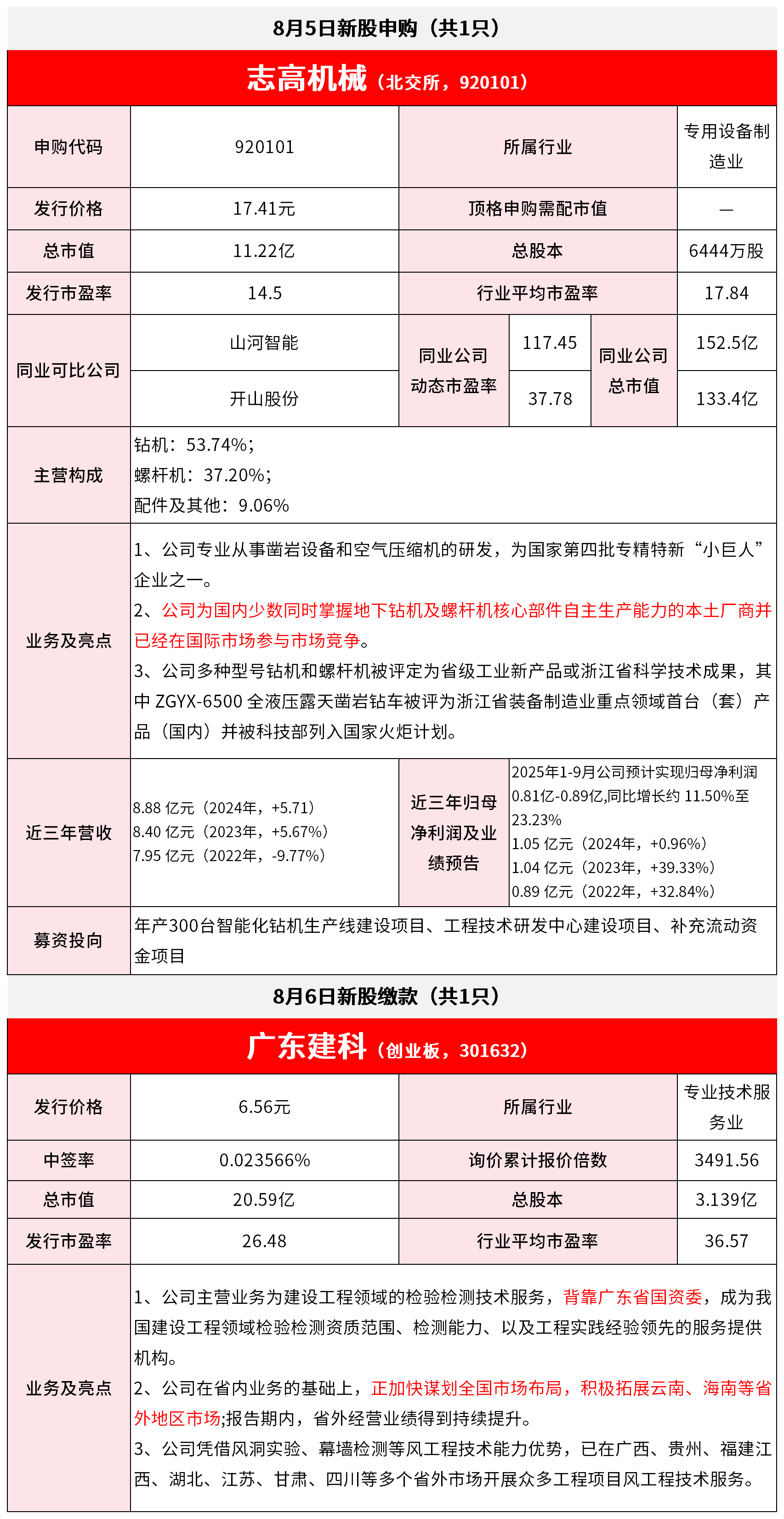 【8月5日IPO雷达】志高机械申购、广东建科缴款