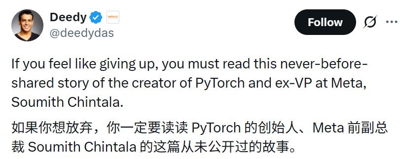 那几年,他被DeepMind拒了三次,连签证都差点失效。 在X上,流传着一个关于PyTorch创始人Soumith Chintala的故事。 他出身普通,数学不好,被美国12所大学拒绝。靠着一张短期签证去美国,无学位、无资金、无计划。 可他没放弃。2017年,他写出了PyTorch。 那个被主流嫌「没前途」的开源项目,一夜之间成了香饽饽。 人们才发现,这个影响全球AI走向的工具,竟出自那个被拒12次的「失败者」之手。 反复被拒的十年 Soumith的起点很普通。 他出生在印度海德拉巴,读一所二本的学校——VIT Vellore。 数学不好、履历普通,这在印度那种内卷到骨子里的教育体系里,意味着前路不太妙。 但他还是想出国读研。那年他拿着1420分的GRE,申请了美国12所大学,可全被拒了。 后来,Soumith Chintala拿到一张J-1签证去了美国,却没有明确的方向,也没钱继续念书。 申请第二轮硕士时,又被拒到只剩南加州大学和NYU。留学梦差点断在签证那一关,那时候几乎所有人都觉得他要放弃了。 可他没有妥协。他选择从亚马逊开始,做一个最不起眼的测试工程师。 Soumith被DeepMind拒了三次,甚至 ...