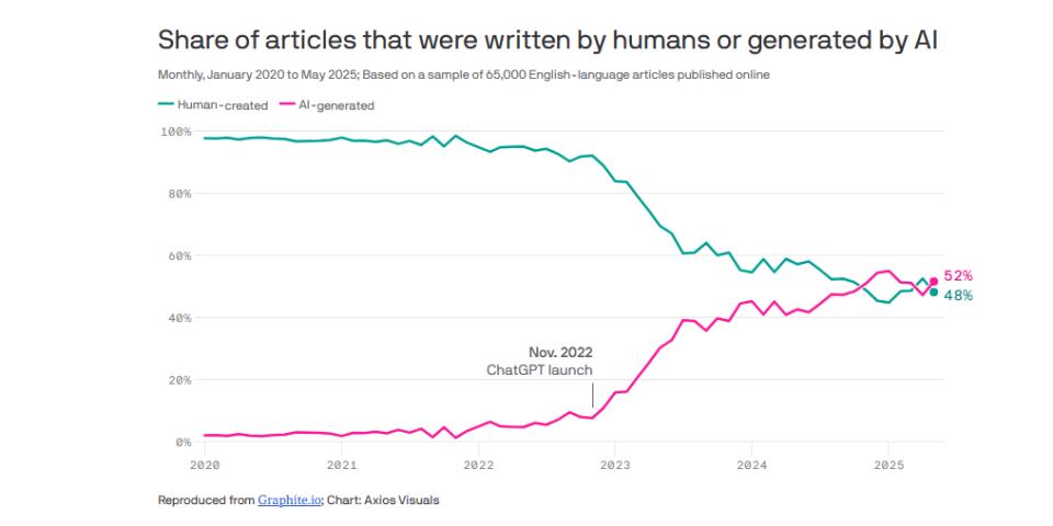 知名搜索引擎优化(SEO)公司Graphite最新研究显示,目前互联网上超过半数的书面内容(英文)都已由AI生成。 "AI算法浪潮"正将我们推向一个前所未有的时代:机器生成的内容不仅与人类创作共存,更在数量上开始占据主导地位。这一根本性转 变,立即引发了关于内容真实性、信息信任度乃至整个数字生态系统本质的深刻质疑。 这种转变将产生直接的深远影响,它正在重塑我们的信息获取方式,改变内容的生产模式,并重新定义AI公司与科技巨头面临的战略格 局。 同时,这也表明生成式AI技术已快速成熟并深度融入各行各业,从最初的实验性工具,转型为内容生产中不可或缺的核心引擎。而当数 字空间日益被算法创作占据时,建立透明的信息披露机制、开发可靠的检测工具,并重新评估人类原创内容的独特价值,已成为我们亟 待解决的迫切问题. 52%背后的轨迹:爆发、赶超与增长瓶颈 自2022年11月ChatGPT发布以来,越来越多的企业开始采用大型语言模型(如ChatGPT、Claude和Gemini)生成内容。相较于动辄花费数 百美元聘请人类作者,AI生成内容以其显著的成本优势,成为企业拓展搜索引擎、社交媒体及广告渠道流量的新选择。 AI内容的爆发式 ...