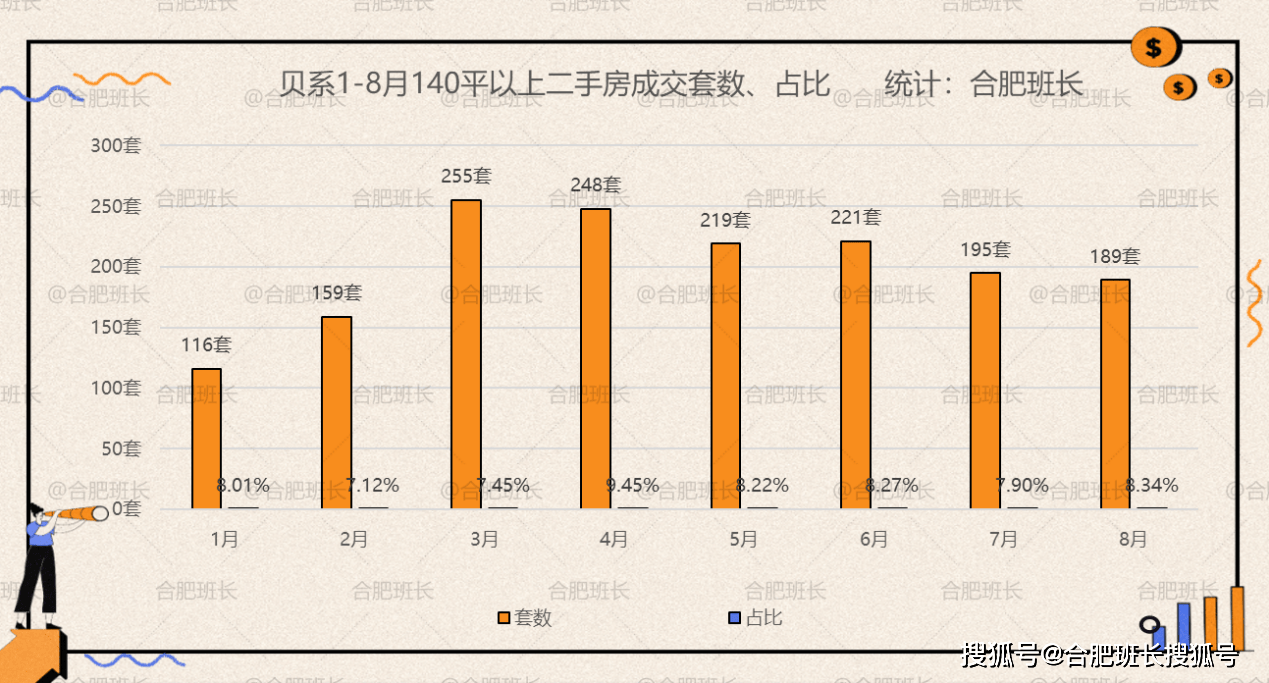 在当前的合肥楼市,新房以改善为主,140平以上户型比比皆是,那二手房市场140平以上房源卖得怎么样?今天我们一起来看看。 PS:本文数据均引用2025年1-8月贝系成交数据,非合肥所有成交,仅供参考。 其中3月成交量最高,有255套;4月140平以上成交房源/当月总成交占比最高,为9.45%;4月以后套数逐月下滑,不过占比相差不大。 区域分布上,蜀山区140平以上成交房源最多,其次是包河、滨湖、高新等区域;三县当中,肥西成交量最多。 2025年贝系1-8月一共成交了约19801套二手房,其中140平(含)以上共成交了1602套,占比约8.1%。 当然,这也和不同区/县挂牌量、成交量有直接关系,如政务区虽然只有125套,但成交占比高达17.3%,远高于平均水平。 均价持续下滑,一方面是房价下行,另一方面是高价房源/小区的成交量缩减。如置地栢悦公馆140平以上户型1-8月合计成交15套,其中4-6月分别有4套、2 套和3套的成交,7-8月各只有一套。 具体来看,8月没有5万以上成交,4万到5万只有1套,3万到4万5套,2万到3万38套;1万到2万最多,有97套,1万以下也有48套。 在均价方面,140平以上成交房 ...