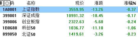 今日,A股三大指数小幅走低,沪指跌0.37%报3559点,深证成指跌0.17%,创业板指跌0.24%。 全天成交1.62万亿元,较前一交易日缩量3420亿元,全市场超3300股上涨。 | 国内的 | 名称 | 现价 | 涨跌 | 涨幅% | | --- | --- | --- | --- | --- | | 1A0001 | 上证指数 | 3559.95 | -13.26 | -0.37 | | 399001 | 深证成指 | 10991.32 | -18.45 | -0.17 | | 399006 | 创业板指 | 2322.63 | -5.68 | -0.24 | | 1B0688 | 科创50 | 1036.77 | -11.10 | -1.06 | | 050668 | 北证50 | 1419.61 | -3.26 | -0.23 | 盘面上,中药板块爆发,华森制药、天目药业及维康药业等多股涨停。 光伏设备板块走高,捷佳伟创20%涨停。教育板块拉升,学大教育涨超7%。 虚拟机器人、快递概念及AI语料等板块涨幅居前。 另外,船舶制造、航母概念走低,ST应急20%跌停。民爆概念走弱,保利联合逼近跌停。 中 ...