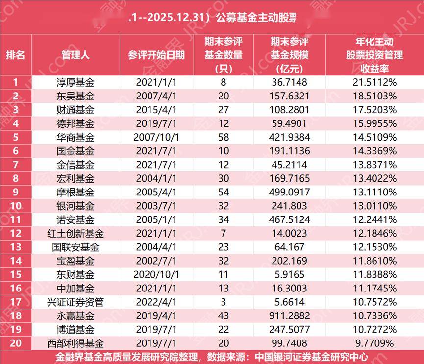 中国银河证券基金研究中心发布的《公募基金长期主动股票投资管理能力榜单》,以近三年、近十年双时间维度数据,清 晰勾勒出公募行业主动权益投资的竞争格局:大型老牌基金公司凭借深厚投研积淀与多元布局彰显业绩持久性,中小型机 构则依托灵活调仓优势突出成长性,两类主体各展所长,共同丰富着市场的投资生态。 观察近三年数据,主动股票投资管理的年化收益率门槛显著高于十年期,这一区间成为中小型基金公司的"秀场"。榜单数 据显示,近三年排名前二十的基金公司中,19家均实现了年化收益率超10%的亮眼成绩。其中,淳厚基金以21.51%的超高 年化收益率位居榜首,财通基金、德邦基金等多家中小型机构的年化收益也均突破15%。 | | | | 1.1-2025.12.31) 公募基金主动股票 | | | | --- | --- | --- | --- | --- | --- | | | | | 期末参评 | 期末参评 | 年代三国 | | 排名 | 管理人 | 参评开始日期 | 重金数量 | 基金规模 | 股票投资量速 | | | | | (日) | (亿元) | 收益率 | | | 大成县金 | 1999/7/1 | 74 | 886.6 ...