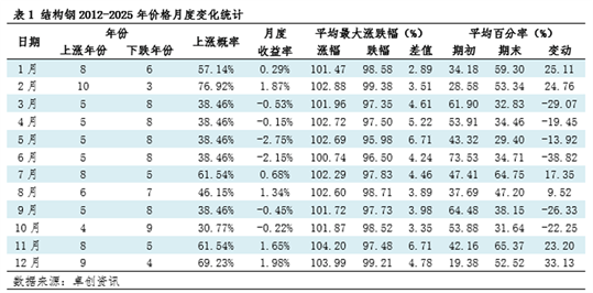 Core Insights - February has historically been the strongest month for structural steel, with a price increase probability of 76.92% from 2012 to 2015, significantly higher than the annual average of 50% [2][4] - The average monthly return for February is 1.87%, ranking third among all months, indicating strong price growth potential [2][4] - The average maximum increase in February is 102.88%, while the average maximum decrease is 99.38%, showcasing a seasonal tendency for prices to rise more easily than to fall [2][4] Market Dynamics - The price increase in February is driven by multiple factors, including a rebound in demand due to post-Spring Festival construction and manufacturing resumption, leading to improved marginal demand [4] - Supply-side dynamics show that steel mills often reduce inventory before the Spring Festival, leading to lower social inventory levels, which can trigger a replenishment trend post-holiday [4] - Cost factors, such as the prices of iron ore and coke, tend to rise after winter storage ends, providing additional support for steel prices [4] Future Outlook - The "February Law" derived from 13 years of data reflects the resonance between industrial cycles and market sentiment, although it is based on probabilities [5] - Current market conditions suggest that while there is some pre-holiday inventory buildup, it may weaken post-holiday replenishment efforts, with seasonal trends likely extending into March [5] - Overall, the first quarter is expected to see a significant probability of structural steel prices experiencing fluctuations upward [5]