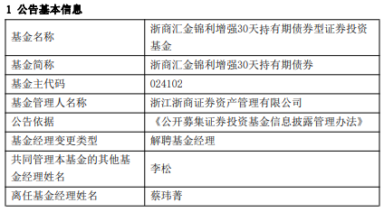浙商汇金锦利增强30天持有期债券A/C成立于2025年9月19日。 | 基金名称 | 浙商汇金锦利增强30天持有期债券型证券投资 | | --- | --- | | | 基金 | | 基金简称 | 浙商汇金锦利增强30天持有期债券 | | 基金主代码 | 024102 | | 基金管理人名称 | 浙江浙商证券资产管理有限公司 | | 公告依据 | 《公开募集证券投资基金信息披露管理办法》 | | 基金经理变更类型 | 解聘基金经理 | | 共同管理本基金的其他基 | 李松 | | 金经理姓名 | | | 离任基金经理姓名 | 蔡玮書 | 中国经济网北京12月9日讯今日,浙商证券(601878)资管公告,蔡玮菁离任浙商汇金锦利增强30天持 有期债券。 蔡玮菁历任浦东发展银行股份有限公司资金总部交易员、太平养老保险股份有限公司投资管理中心投资 经理、国投瑞银基金管理有限公司固定收益部副总监兼基金经理。2021年5月加入浙江浙商证券资产管 理有限公司,现任公司公募固定收益投资部行政负责人。 ...