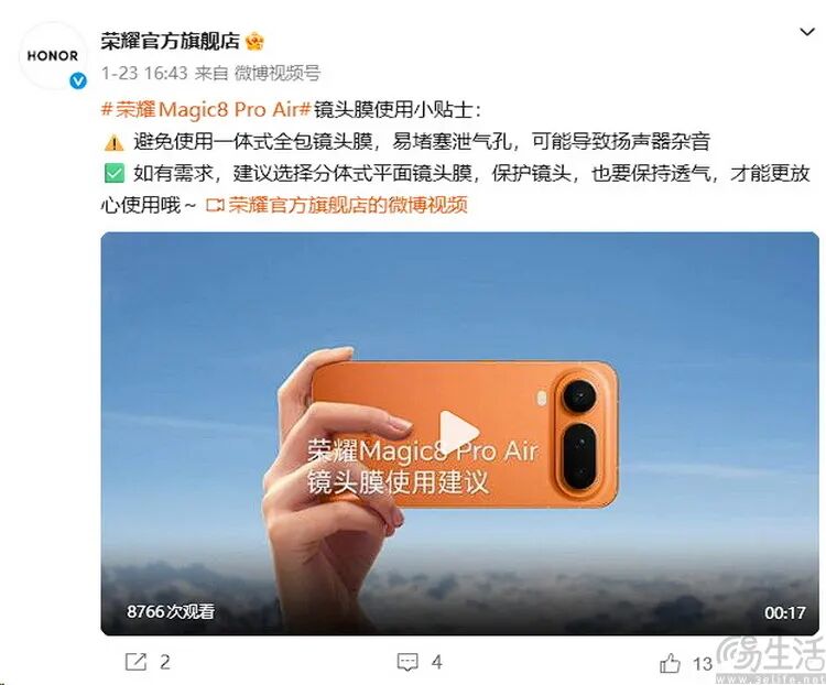 有意思的是,其实这已经不是荣耀方面第一次对"镜头膜"发声了。此前在去年11月,荣耀影像系统专家 @Aaron是个理工男 就曾在微博上表示,强烈建议用户不要使用"镜头膜",因其会严重恶化成像清晰度和 对比度。 2026年1月23日,就在荣耀Magic8 RSR、Magic8 Pro Air这两款新机开售的同一天,@荣耀官方旗舰店 发文 称,用户应避免使用一体式全包镜头膜,因其"易堵塞泄气孔,可能导致扬声器杂音"。 图片来自荣耀官方社区 更早之前,荣耀首席影像工程师罗巍也曾发文,建议用户"不用贴镜头膜",因为现在手机用的都是高强度 玻璃,"不需要"靠镜头膜来额外保护,且镜头膜会影响拍照效果,还会导致扬声器杂音。 不难看出,荣耀方面为了劝阻用户使用镜头贴膜,几乎到了每发布一次重点产品,都要提一回的程度。但 这也反过来说明,部分用户对于"镜头膜"的迷信,可能已经到了难以纠正的地步。而且很可能这些用户在 贴了镜头膜后,发现手机拍照变差了,扬声器也出现了杂音,还不"舍得"撕掉镜头膜,反而会找手机厂 商"扯皮",所以才逼得荣耀方面不得不一次又一次地发声。 那么,为什么镜头膜会导致拍照效果劣化,并影响到手机扬声器的效果,又为 ...