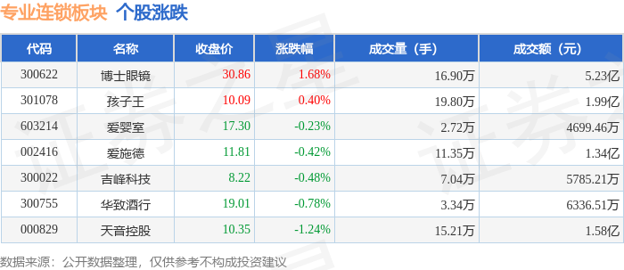 从资金流向上来看,当日专业连锁板块主力资金净流出4073.71万元,游资资金净流出1387.15万元,散户 资金净流入5460.86万元。专业连锁板块个股资金流向见下表: | 代码 | 名称 | 主力净流入 (元) | 主力净占比 游资净流入 (元) | | 游资净占比 散户净流入 (元) | | 散户净占比 | | --- | --- | --- | --- | --- | --- | --- | --- | | 603214 | 爱歌室 | = 420.81万 | 8.95% | -128.44万 | -2.73% | -292.37万 | -6.22% | | 300622 博士眼镜 | | 152.02万 | 0.29% | -3881.47万 | -7.43% | 3729.45万 | 7.14% | | 300755 华致酒行 | | -63.83万 | -1.01% | 306.00万 | 4.83% | -242.17万 | -3.82% | | 301078 | 孩子王 | -413.67万 | -2.08% | 346.38万 | 1.74% | 67.30万 | 0.34% | | 00 ...