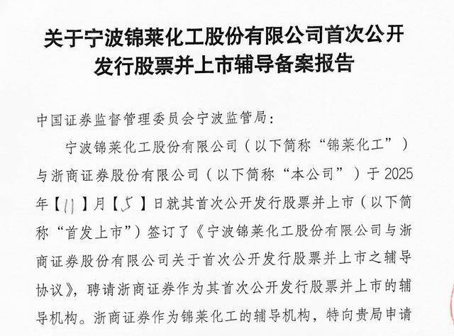 瑞财经 刘治颖 11月7日,宁波锦莱化工股份有限公司(以下简称:锦莱化工)在宁波证监局完成IPO辅 导备案,辅导机构为浙商证券股份有限公司。 据查,锦莱化工成立于2005-03-08,法定代表人为朱贤超,注册资本为6000万元,经营范围包含:专用 化学产品制造;化工产品生产;货物进出口等。该公司控股股东为朱兴荣,直接持有公司69.84%股 份。 目前,朱兴荣担任公司董事长,朱贤超担任公司董事兼总经理。 官网显示,锦莱化工是家化工高科技企业,公司与国际国内多家专业化工研究院合作,引进先进成熟的 甲代烯丙基氯(MAC);甲基烯丙醇(MAOH);甲基丙烯磺酸钠(SMAS);腈纶油剂;聚酰亚胺纤维 油剂等生产技术。产品已销往美国、日本、德国、法国等五十多个国家,是中石油、中石化定点供应 商,也是全球500强企业的合作伙伴。 ...