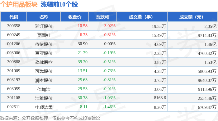 从资金流向上来看,当日个护用品板块主力资金净流出5141.02万元,游资资金净流出923.25万元,散户 资金净流入6064.27万元。个护用品板块个股资金流向见下表: | 代码 | 名称 | 主力净流入(元) | 主力净占比 游资净流入 (元) | | 游资净占比 散户净流入 (元) | | 散户净占比 | | --- | --- | --- | --- | --- | --- | --- | --- | | 301009 可靠股份 | | = 449.24万 | 8.86% | -137.35万 | -2.71% | -311.90万 | -6.15% | | 605009 豪悦护理 | | 253.39万 | 2.63% | 286.20万 | 2.97% | -539.60万 | -5.60% | | 301108 洁雅股份 | | 44.63万 | 1.57% | -4.75万 | -0.17% | -39.88万 | -1.41% | | 001328 登康口腔 | | 30.10万 | 0.88% | 9.58万 | 0.28% | -39.68万 | -1.16% | | 600249 两面针 ...