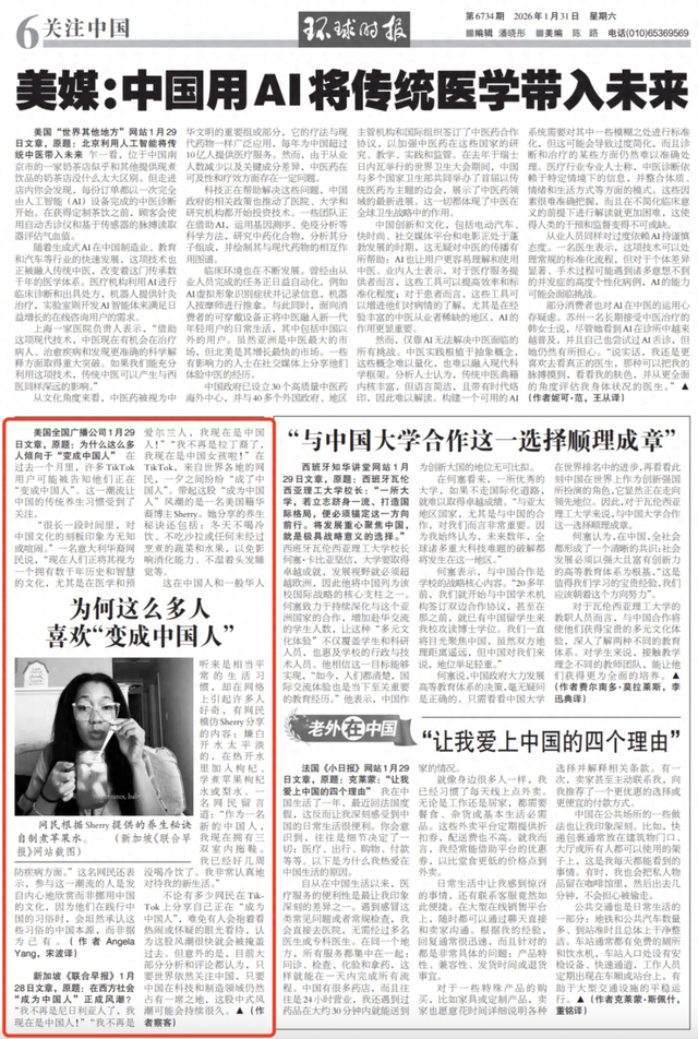 不论有多少网民在TikTok上分享自己正在"成为中国人",难免有人会抱着看热闹或怀疑的眼光看待,认 为这股风潮很快就会被掩盖过去。但意外的是,目前大部分分析和评论都认为,只要世界依然关注中 国,只要中国在科技和制造领域仍然占有一席之地,这股中式风潮可能会持续很久。(作者察客) 第6734期 2026年1月31日 星期六 目编辑 潘晓彤 ■美编 陈 路 电话(010)65369569 美国全国广播公司1月29日文章,原题:为什么这么多人倾向于"变成中国人" 在过去一个月里,许多TikTok用户可能被告知他们正在"变成中国人"。这一潮流让中国的传统养生习惯 受到了关注。 "很长一段时间里,对中国文化的刻板印象为无知或喧闹。"一名意大利华裔网民说,"现在人们正将其 视为一个拥有数千年历史和智慧的文化,尤其是在医学和预防疾病方面。"这名网民还表示,参与这一 潮流的人是发自内心地欣赏而非挪用中国的文化,因为他们在践行中国的习俗时,会坦然承认这些习俗 的中国本源,而非据为己有。(作者Angela Yang,宋波译) 新加坡《联合早报》1月28日文章,原题:在西方社会"成为中国人"正成风潮? "我不再是尼日利亚人了,我现在 ...