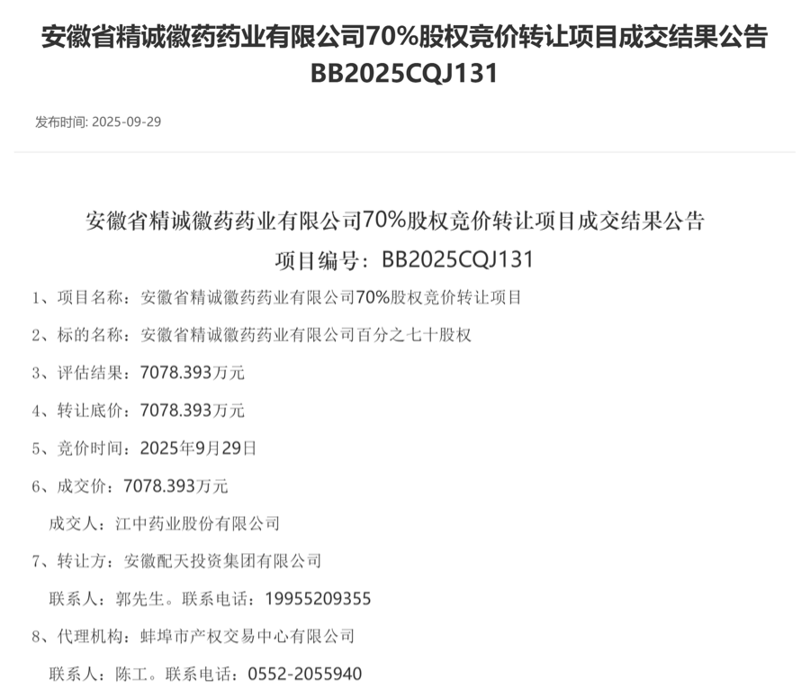 21世纪经济报道记者 唐唯珂 报道 华润系在医药领域的整合步伐持续加快。 近日,华润旗下江中药业(600750)宣布,已与蚌埠投资集团签署股权转让协议,以7078.393万元收购安徽省精诚徽药70%股 权,交易完成后将获得其实际控制权并纳入合并报表。 此次收购的一大焦点是高溢价。转让公告显示,精诚徽药净资产为4198.24万元,但评估价值高达10111.99万元,评估增值率达 140.86%。 精诚徽药成立于2013年11月,虽为小型企业,但具备"高新技术企业""专精特新中小企业"具备资质,核心聚焦中药补益类OTC产 品。其代表品种包括六味地黄口服液、脑力静糖浆及脑力静胶囊等,在区域补益类用药市场具备一定产品基础。 华南某券商分析师向21世纪经济报道记者表示,此次通过整合标的成熟的补益类OTC产品,江中药业有望快速承接市场增量, 也标志着华润健康集团在中药版图上的又一次扩围。 图:招采信息安徽省招标投标信息网 江中牌健胃消食片作为经典品种,一直是江中药业OTC业务的"压舱石",但这款30年前的品种已面临诸多挑战和增长瓶颈。 面对经典产品增长承压,开发新产品成为关键。然而,研发投入不足是OTC药企的普遍情况。据 ...