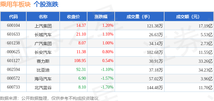 证券之星消息,1月28日乘用车板块较上一交易日下跌0.81%,赛力斯领跌。当日上证指数报收于4151.24,上涨0.27%。深证成指报收于14342.9, 上涨0.09%。乘用车板块个股涨跌见下表: | 代码 | 名称 | 收盘价 | 涨跌幅 | 成交量(手) | 成交额(元) | | --- | --- | --- | --- | --- | --- | | 002594 | 比亚迪 | 93.34 | 1.67% | 71.56万 | 65.53 Z | | 601633 | 长城汽车 | 20.87 | -1.04% | 20.36万 | 4.26 Z | | 600104 | 上汽集团 | 14.20 | -1.25% | 95.18万 | 13.55亿 | | 601238 | 广汽集团 | 7.99 | -1.48% | - 44.58万 | 3.58亿 | | 000625 | 长安汽车 | 11.29 | -1.57% | 101.56万 | 11.49 Z | | 000572 | 海马汽车 | 7.01 | -2.09% | 53.43万 | 3.75 Z | | 600733 | 北汽蓝 ...