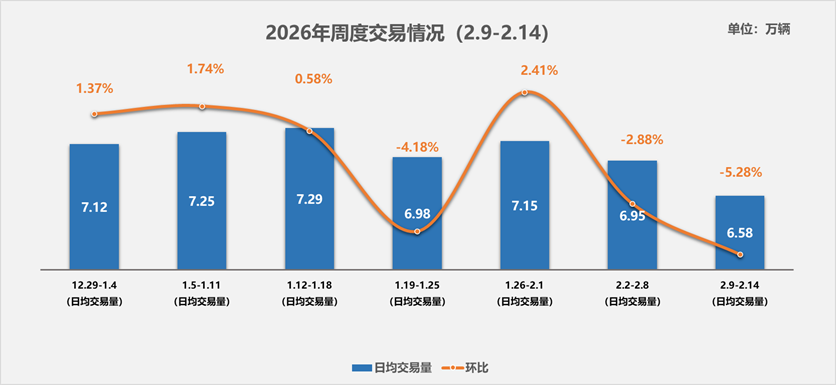中国汽车流通协会:2月9-14日二手车市场日均交易量为6.58万辆 环比前一周下降5.28%