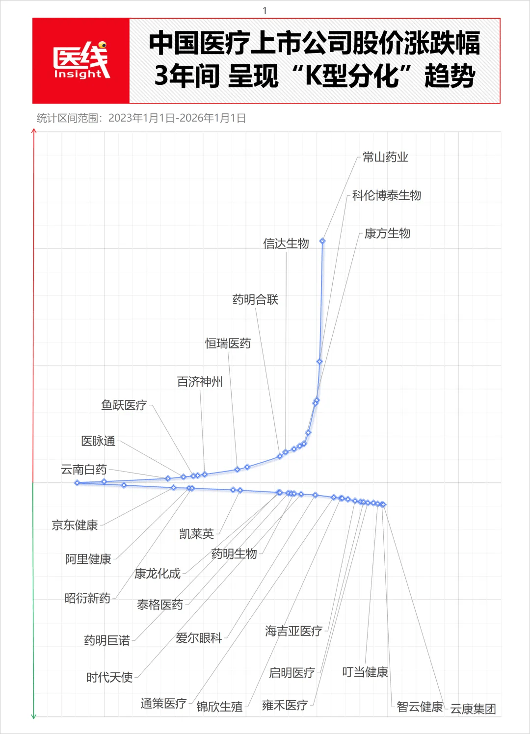 文 | 医线Insight,作者丨雨山 站在2026年的开端回望,中国医疗行业刚刚经历了一场史无前例的大分流时刻。 如果说2020—2022年是医药投资的"黄金时代",那时候PPT能融资,亏损能上市,只要沾上CXO、消费医疗或互联网医疗的概念,估值就能给到60倍甚至 100倍。 彼时,资本市场对"规模"的崇拜远胜于对"利润"的考量,对"概念"的追逐远胜于对"临床价值"的深究。 然而,2023—2025年,行业进入了一场漫长而寒冷的"泡沫出清期"。 但这并不是一个简单的普跌熊市故事。医线Insight通过wind梳理过去3年A股与港股393家医疗上市公司(剔除近2年上市企业)的核心数据,并结合详细的 个股涨跌幅,看到了一个极度分裂的医疗江湖——一场惨烈的"K型分化"趋势。(文末附3年区间里,各上市公司涨跌幅全名单) 数据来源:Wind;数据为部分代表企业,详细名单见文末 制图:医线Insight 在K线下方,是旧秩序的崩塌:曾经的千亿白马、CXO巨头、消费医疗、互联网医疗平台,市值批量腰斩,甚至有的明星企业市值蒸发高达90%以上 。 这是旧有增长模型(靠融资驱动、靠营销驱动、靠人口红利)的失效。 而在K线的上方 ...