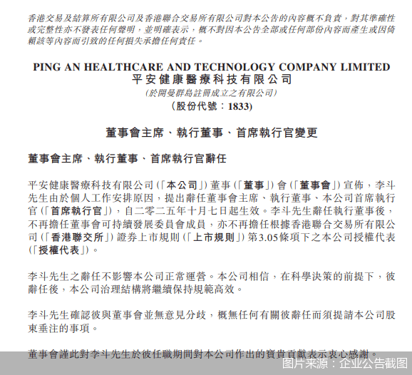 平安好医生人事变动:李斗辞任,郭晓涛、何明科接任董事会主席及CEO