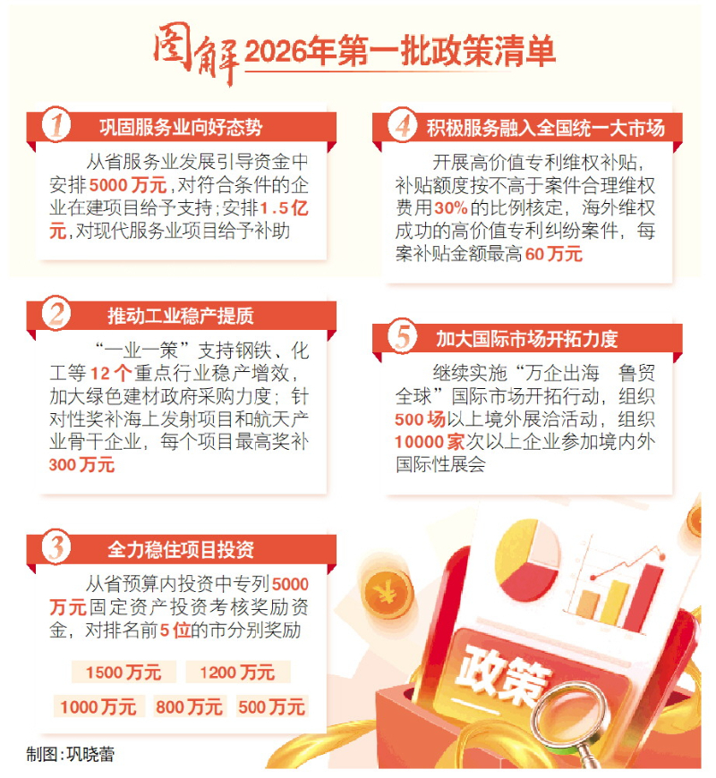 山东省政府网站今天(2025年12月31日)正式发布《2026年促进经济"稳中求进、提质增效"政策清单(第一 批)》。2026年的首批政策清单,共包括五个方面28项政策举措,其中20项政策为奖励补助类,资金全部用于支 持优质企业发展和项目建设,让企业更有获得感,进一步激发市场活力。 政策集成供给是近年来省委、省政府稳经济的创新举措、有力抓手。2025年山东省先后出台三批政策清单, 为经济发展注入持续动力。在此基础上出台的2026年第一批政策清单,加力扩需求、优供给,做足增量上,精准 发力增强服务业支撑作用、提速重点项目建设,培育新增长点;遏制减量上,突出支持稳住重点工业行业、建筑 业;应对变量上,重点帮扶企业开拓海外市场,为全省经济持续回升向好提供有力支撑。 巩固服务业向好态势被置于首要位置。根据《政策清单》,山东省将重点支持新纳统以及"准规上"企业,从 省服务业发展引导资金中安排5000万元,对符合条件的企业在建项目给予支持;安排1.5亿元,对现代服务业项目 给予补助,其中,安排9000万元围绕人工智能、工业互联网、科技研发、检验检测、质量认证等重点领域,支持 高端生产性服务业企业项目建设,安排6000万元 ...