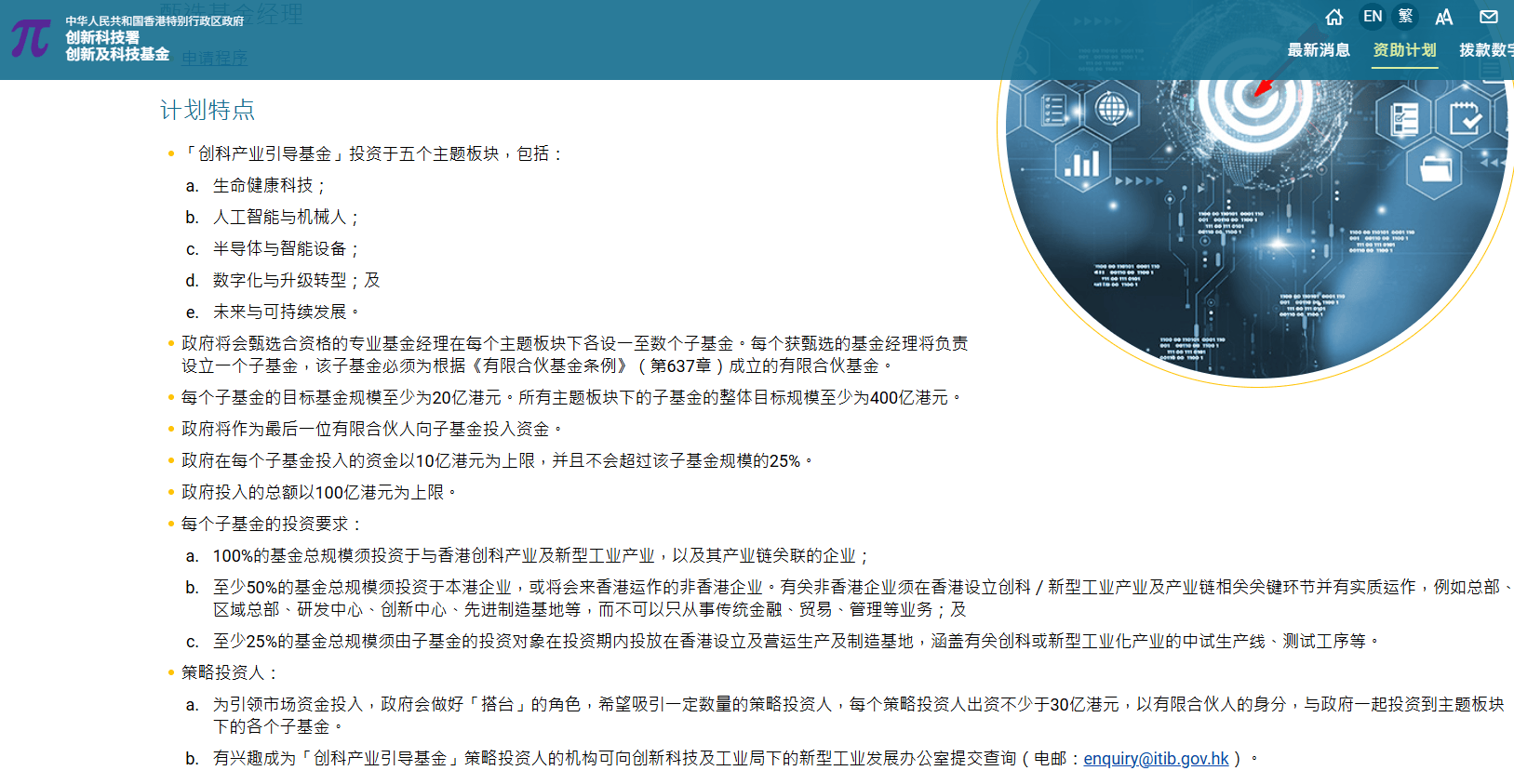 投资界11月17日消息,近日,香港创新科技署通过官网宣布,规模达100亿港元的"创科产业引导基金"正式进入基金经理公开遴选阶段,有意向的机构需在 2026年1月16日前提交申请材料。据悉,这只百亿引导基金的设立旨在对接国家"耐心资本"发展战略,推动"政、产、学、研、投"高效协作,通过政府资金 的引领和杠杆作用,吸引更多社会资本涌入创科产业,助力策略性新兴及未来产业发展。基金明确聚焦五大投资主题板块,分别是生命健康科技、人工智能 与机械人、半导体与智能设备、数字化与升级转型及未来与可持续发展。 此外官网还指出为引领市场资金投入,政府会做好「搭台」的角色,希望吸引一定数量的策略投资人,每个策略投资人出资不少于30亿港元,以有限合伙人 的身分,与政府一起投资到主题板块下的各个子基金。 来源:香港创新科技署官网 根据公告要求,政府将甄选合资格的专业基金经理,在每个主题板块下各设立一至数个子基金,每个子基金目标规模至少20亿港元,所有子基金整体目标规 模不低于400亿港元。 同时,子基金需满足三项核心投资要求:一是100%基金规模须投向与香港创科产业、新型工业产业及其产业链关联的企业;二是至少50%基金规模需投资 于香 ...