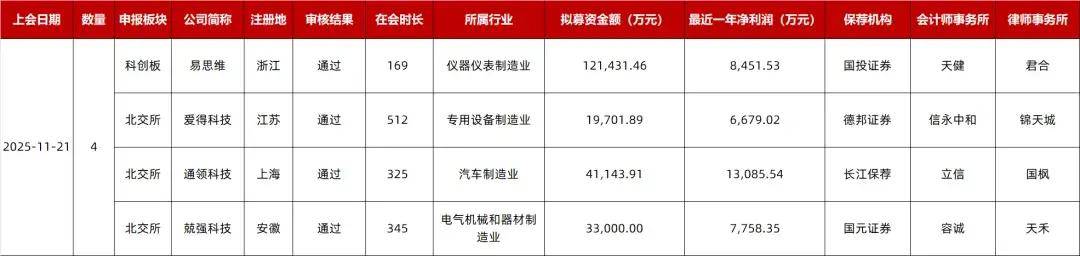 IPO审核结果 据交易所官网审核动态信息,今日4家企业IPO上会,全部获审核通过,合计拟募资21.53亿元。 | 上会日期 | 数量 申报板块 | | 公司简称 | 武注册 | | 审核结果 在会时长 | 所属行业 | 拟募资金额(万元) | 最近一年净利润(万元) | 保存机构 | 会计师事务所 | 律师事务所 | | --- | --- | --- | --- | --- | --- | --- | --- | --- | --- | --- | --- | --- | | 2025-11-21 | 4 | 科创板 | 易思维 | 浙江 | 通过 | 169 | 仪器仪表制造业 | 121,431.46 | 8,451.53 | 国投证券 | 天健 | 君合 | | | | 北交所 | 爱得科技 | 江苏 | 通过 | 512 | 专用设备制造业 | 19,701.89 | 6,679.02 | 德邦证券 | 信永中和 | 锦天城 | | | | 北交所 | 通领科技 | 宋十 | 通过 | 325 | 汽车制造业 | 41,143.91 | 13,085.54 | 长江保荐 | 立信 | 国权 | | ...