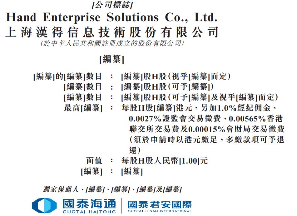 智通财经APP获悉,据港交所12月29日披露,上海汉得信息技术股份有限公司(简称:汉得信息(300170.SZ))向港交所主板提交上市申 请,国泰君安融资有限公司为其独家保荐人。招股书披露,汉得信息是中国领先的企业IT咨询与数字解决方案服务供应商。根据弗若 斯特沙利文的资料,在竞争激烈且高度分散的中国企业IT咨询与数字解决方案服务市场中(2024年市场规模达人民币1,906.7亿元),公司 以营收计的市场占有率在综合排名中位居第四、中国本土企业之首。 /公司標誌] Hand Enterprise Solutions Co., Ltd. 上海漢得信息技術股份有限公司 【编纂】的[编纂]數目 :「編纂]股H股(視乎[編纂]而定) |编纂|數目 【编纂】股H股(可予隔纂]) · [編纂]股H股(可予[編纂]及視乎[編纂]而定) |编纂|數目 ·· 每股H股[編纂]港元,另加1.0%經紀佣金、 最高|编纂| ·· 0.0027%證監會交易徵費、0.00565%香港 聯交所交易費及0.00015%會財局交易徵費 (須於申請時以港元繳足,多繳款項可予退 還) 每股H股人民幣[1.00]元 面值 : 【编纂】: 【编纂】 ...