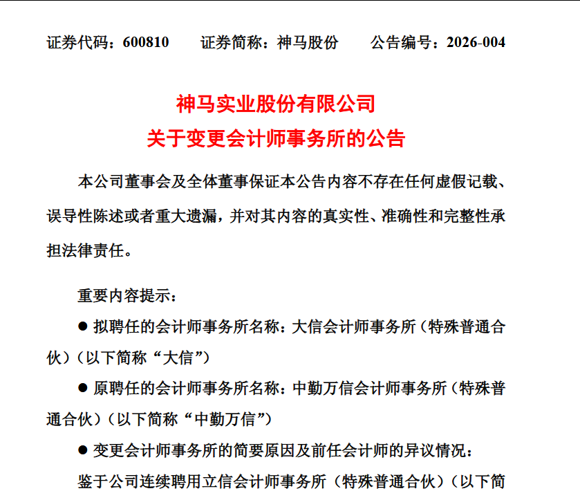 神马实业股份有限公司1月9日晚间公告,拟聘任大信会计师事务所(特殊普通合伙)为公司2025年度财务审计机构和内部控制审计机构,接替原计划的中勤 万信会计师事务所(特殊普通合伙)。 神马股份(600810)此次变更会计师事务所的决定,距其聘任中勤万信仅过去三个月。 根据公告,神马股份原审计机构立信会计师事务所已连续服务满10年。2025年8月28日,公司董事会及同年10月10日股东大会审议通过,聘任中勤万信为 2025年度审计机构。 然而,中勤万信近期因"2025年度审计任务繁重、人员调整、其他项目时间安排变动等因素",预计无法如期完成神马股份2025年度财务报告与内部控制审 计任务。经沟通,中勤万信对此变更无异议,并将按规定做好前后任会计师事务所的沟通配合工作。 深圳商报.读创客户端记者舒桂林 编辑石展溥责编朱峰校审宋华 大信会计师事务所成立于1985年,2012年转制为特殊普通合伙制,总部位于北京,是全国首批获得H股企业审计资格的会计师事务所之一。截至2025年12 月31日,大信拥有合伙人182人、注册会计师1053人,其中超过500人签署过证券服务业务审计报告。2024年度,大信为221家上市公司提供年 ...