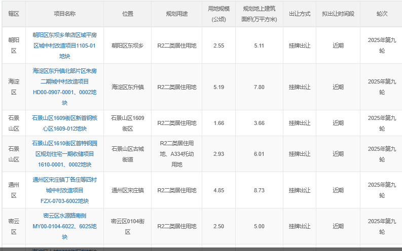 新京报贝壳财经讯 (记者袁秀丽)11月21日,北京市规划和自然资源委员会网站发布了2025年第九轮拟供应商 品住宅用地清单,共涉及6宗地,土地面积约20公顷,建筑规模约36万平方米,计划于近期供应。 本轮推出的地块全部位于市场需求突出、基础设施和公共服务配套较完善的区域。从区域分布来看,中心城区占 4宗,分别为朝阳区1宗、海淀区1宗、石景山区2宗;此外,通州区与密云区各有1宗。 通州区宋庄镇丁各庄等四村城中村改造项目FZX-0703-6002地块,位于通州区宋庄镇,六环外。周边有谷德玛特 购物广场、华联购物中心(六合新村店)、北京安贞医院通州院区、宋庄文化创意公园、路县故城遗址公园等生 活配套设施。 密云区水源路南侧MY00-0104-6022、6025地块,位于密云区0104街区,六环外。周边有北京密云万象汇、燕赛 奥特莱斯购物中心、国泰百货(密云店)、北京大学第一医院密云院区、奥林公园等生活配套设施。 | 辖区 | 项目名称 | 位置 | 规划用途 | 用地规模 (公顷) | 规划地上建筑 面积(万平方米) | 出让方式 | 拟出让时间段 | | | --- | --- | --- | --- | --- ...
