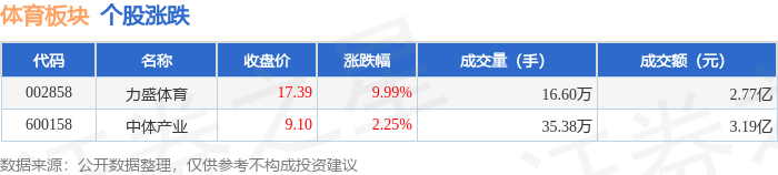 证券之星消息,1月12日体育板块较上一交易日上涨3.9%,力盛体育领涨。当日上证指数报收于 4165.29,上涨1.09%。深证成指报收于14366.91,上涨1.75%。体育板块个股涨跌见下表: | 代码 | 名称 | 收盘价 | 涨跌幅 | 成交量(手) | 成交额(元) | | | --- | --- | --- | --- | --- | --- | --- | | 002858 | 力盛体育 | 17.39 | 9.99% | 16.60万 | | 2.77亿 | | 600158 | 中体产业 | 9.10 | 2.25% | 35.38万 | | 3.19亿 | 从资金流向上来看,当日体育板块主力资金净流入3131.78万元,游资资金净流出4017.44万元,散户资金 净流入885.66万元。体育板块个股资金流向见下表: | 代码 名称 主力净流入(元) 主力净占比 游资净流入(元) 游资净占比 散户净占比 | | | | | | | | --- | --- | --- | --- | --- | --- | --- | | 002858 力盛体育 | 2680.91万 | 9.68% | -1 ...