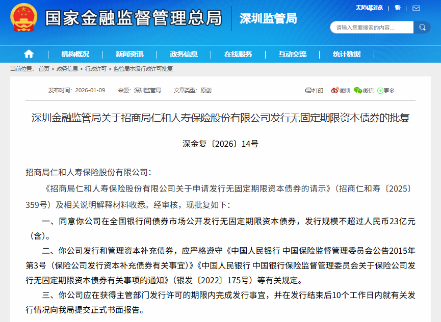 招商局仁和人寿获批发行不超过23亿元无固定期限资本债券