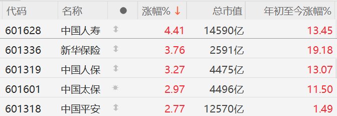 格隆汇1月13日|A股市场保险股集体走强,其中,中国人寿涨超4%,新华保险、中国人保涨超3%,中 国太保、中国平安涨近3%。 MACD金叉信号形成,这些股涨势不错! | 代码 | 名称 | . | 涨幅%↓ | 总市值 | 年初至今涨幅% | | --- | --- | --- | --- | --- | --- | | 601628 | 中国人寿 | 1 | 4.41 | 14590亿 | 13.45 | | 601336 | 新华保险 | + | 3.76 | 2591亿 | 19.18 | | 601319 | 中国人保 | 1 | 3.27 | 4475亿 | 13.07 | | 601601 | 中国太保 | 安 | 2.97 | 4496亿 | 11.50 | | 601318 | 中国平安 | 1 | 2.77 | 12570亿 | 1.49 | ...