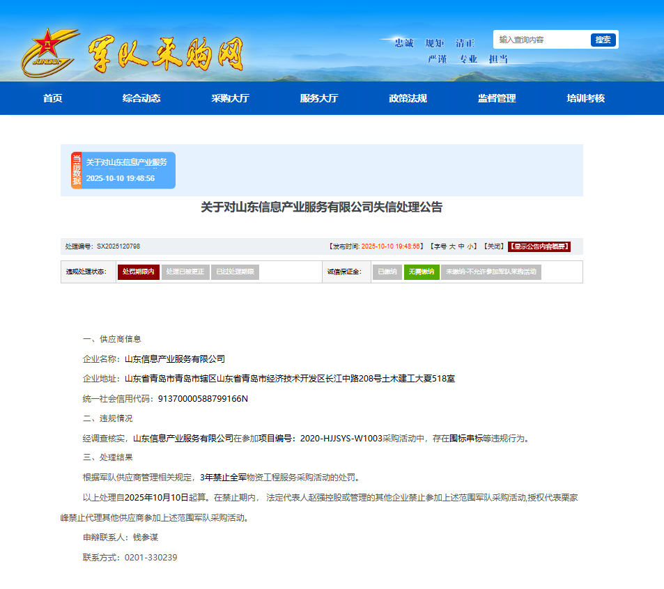 一、供应商信息 企业名称:山东信息产业服务有限公司 近日,军队采购网发布关于对山东信息产业服务有限公司失信处理公告。 三、处理结果 根据军队供应商管理相关规定,3年禁止全军物资工程服务采购活动的处罚。 企业地址:山东省青岛市青岛市辖区山东省青岛市经济技术开发区长江中路208号土木建工大夏518室 以上处理自2025年10月10日起算。在禁止期内,法定代表人赵强控股或管理的其他企业禁止参加上述范围军队采购活动,授权代表栗家 峰禁止代理其他供应商参加上述范围军队采购活动。 统一社会信用代码:91370000588799166N 二、违规情况 经调查核实,山东信息产业服务有限公司在参加项目编号:2020-HJJSYS-W1003采购活动中,存在围标串标等违规行为。 ...