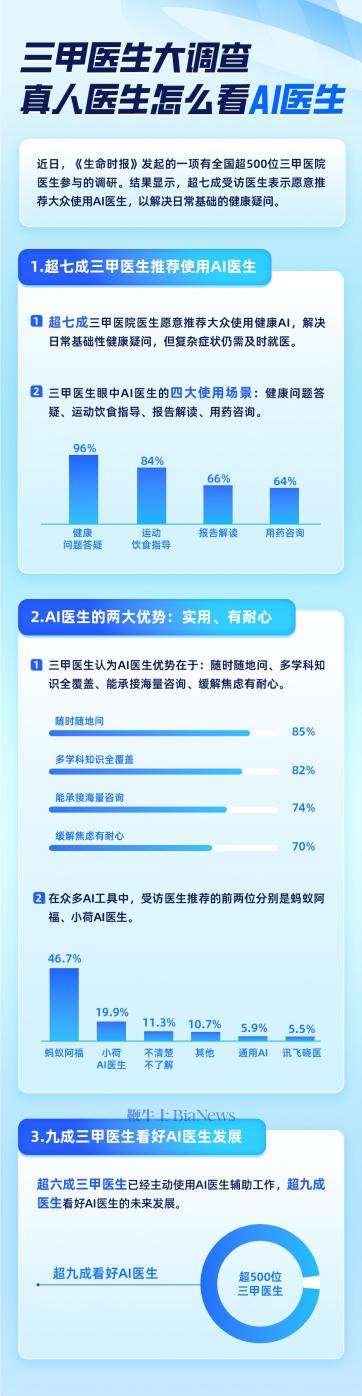 1月12日,近日,《生命时报》发布了一项有全国超500位三甲医院医生参与的调研。调研 结果显示,超七成受访医生表示愿意推荐大众使用AI医生,用以解决日常基础的健康疑问,62% 的受访医生已经在使用AI医生辅助自己工作,90%的受访医生表示看好AI医生的未来发展。 此外,数据显示,目前62%的受访医生已经主动使用AI医生辅助工作,超九成医生看好AI医生的 未来发展。在国内,真人医生开设"AI分身"扩大服务范围的趋势也在兴起。公开信息显示,在健 康AI蚂蚁阿福平台上,已有500多位三甲医院医生开设了自己的"AI分身",7*24小时在线解答用 户咨询。 (转载自新浪科技) ...