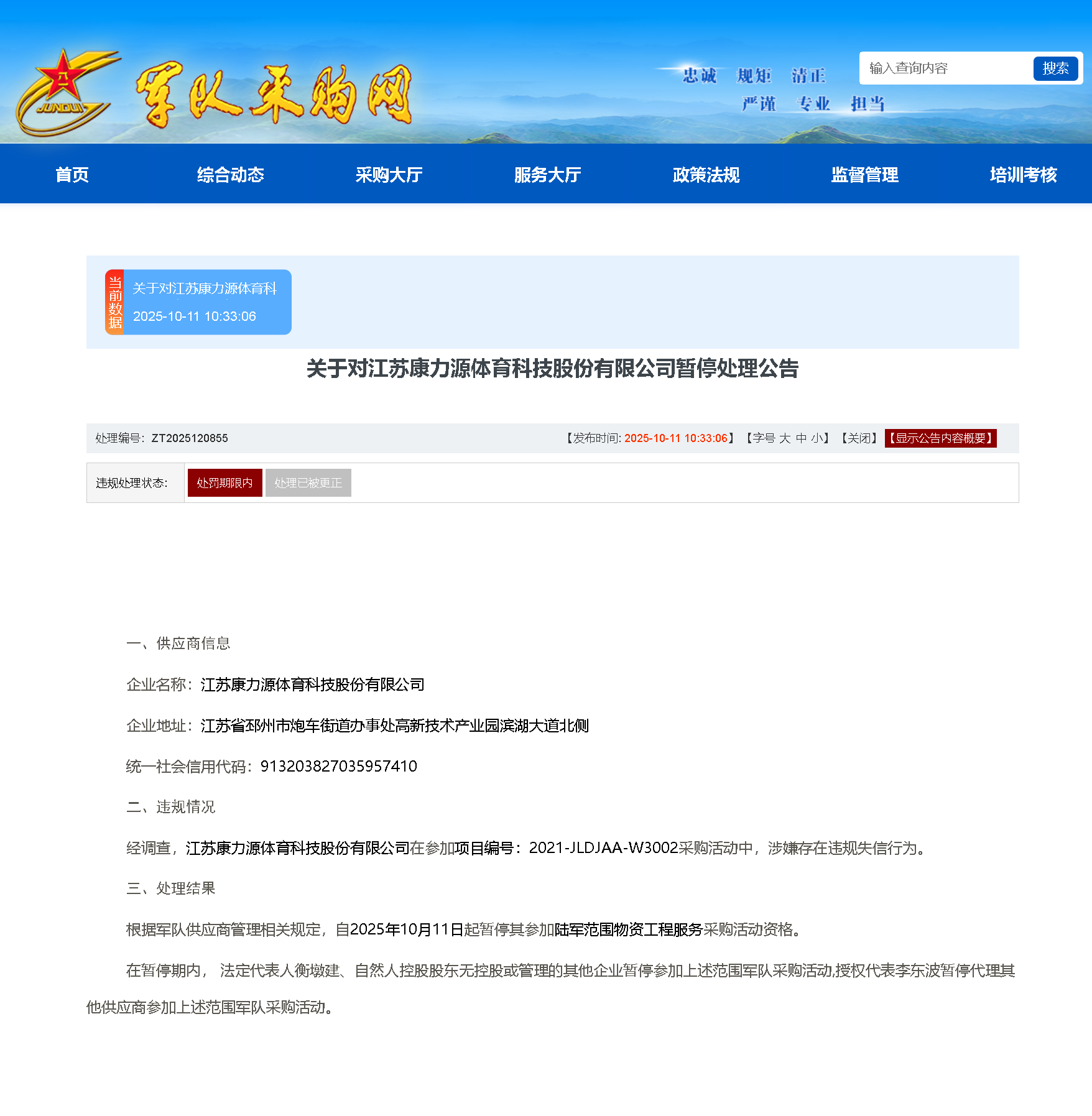 根据军队供应商管理相关规定,自2025年10月11日起暂停其参加陆军范围物资工程服务采购活动资格。 在暂停期内,法定代表人衡墩建、自然人控股股东无控股或管理的其他企业暂停参加上述范围军队采购活动,授权代表李东波暂停代理其他供应商参加上述 范围军队采购活动。 10月11日,军队采购网发布关于对江苏康力源体育科技股份有限公司暂停处理公告。 经调查,江苏康力源体育科技股份有限公司在参加项目编号:2021-JLDJAA-W3002采购活动中,涉嫌存在违规失信行为。 江苏康力源体育科技股份有限公司成立于1998年,是一家专注于多系列健身器材研发、制造与销售的高新技术企业。2023年6月14日,江苏康力源体育科技 股份有限公司(股票代码:301287,简称:"康力源")在深圳证券交易所创业板上市。 产品中心 视频中心 服务中心 招商加盟 15117 "体育强则中国强,国运兴则体育兴"。 「携手致远,共赢未来」 "快乐运动,智慧健身"。 康力源-家庭健身器材领跑者,全民健身综合服务商。 江苏康力源体育科技股份有限公司成立于1998年,是一家专注于多系列健身器材研发、制造与销售 结合、室内与室外结合、家用与商用结合的综合性健 ...