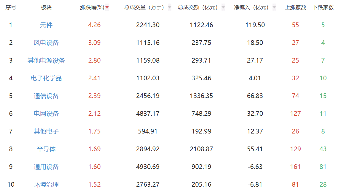 A股市场板块涨跌幅排行 | 序号 | 板块 | 涨跌幅(%)▼ | | 总成交量 (万手) ▼ 总成交额 (亿元) ▼ | 净流入 (亿元) ▼ | 上涨家数 | 下跌。 | | --- | --- | --- | --- | --- | --- | --- | --- | | 1 | 元件 | 4.20 | 1453.90 | 757.38 | 106.25 | 57 | ന | | 2 | 风电设备 | 2.60 | 655.05 | 147.38 | 16.81 | 27 | য | | 3 | 通信设备 | 2.29 | 1767.24 | 934.12 | 69.76 | 75 | 1 - | | ব | 其他电源设备 | 2.14 | 734.54 | 185.06 | 22.50 | 26 | 7 | | 5 | 电网设备 | 2.09 | 3151.25 | 481.89 | 36.51 | 122 | 17 | | 6 | 通信服务 | 2.06 | 1567.29 | 323.79 | 32.94 | રૂટ | ପି | | 7 | 电子化学品 | 1.58 | 712.63 | 204 ...