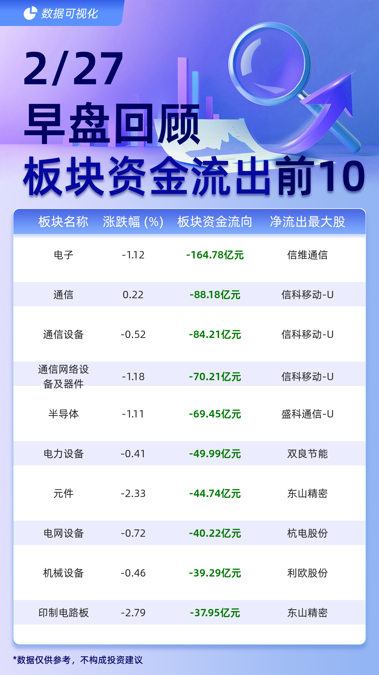 | 元件 | -2.33 | -44.74亿元 | 东山精密 | | --- | --- | --- | --- | | 电网设备 | -0.72 | -40.22亿元 | 杭电股份 | | 机械设备 | -0.46 | -39.29亿元 | 利欧股份 | | 印制电路板 | -2.79 | -37.95亿元 | 东山精密 | | *数据仅供参考,不构成投资建议 | | | | 据交易所数据显示,截至2月27日午间收盘,大盘主力资金净流出294.49亿元。主力资金流出前十大板块分别为:电子(-164.78亿元)、通信(-88.18亿 元)、 通信设备(-84.21亿元)、通信网络设备及器件(-70.21亿元)、 半导体(-69.45亿元)、 电力设备(-49.99亿元)、元件(-44.74亿元)、 电网设备 (-40.22亿元)、 机械设备(-39.29亿元)、印制电路板(-37.95亿元)。 | | 板块名称 涨跌幅(%) 板块资金流向 | | 净流出最大 | | --- | --- | --- | --- | | 电子 | -1.12 | -164.78亿元 | 信维通信 | | 通信 | 0.22 | ...
