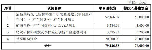 本次可转换公司债券在发行完成前如遇银行存款利率调整,则由公司股东会授权董事会(或由董事会授 权人士)对票面利率作相应调整。 中国经济网北京11月17日讯 莱特光电(688150.SH)11月17日披露的向不特定对象发行可转换公司债券预 案显示,本次发行可转债募集资金总额(含发行费用)不超过人民币76,600.00万元(含本数),扣除发 行费用后的募集资金净额将用于以下项目:"蒲城莱特光电新材料生产研发基地建设项目生产车间1、生 产车间3和生产车间4项目""蒲城莱特生产车间数智化升级改造项目""钙钛矿材料研发及器件验证创新平 台建设项目""补充流动资金"。 | | | | 甲仪: | | --- | --- | --- | --- | | 房貸 | 项目名称 | 项目总投资 | 拟投入募集资金 | | | 蒲城菜特光电新材料生产研发基地建设项目生产 车间 1、生产车间 3和生产车间 4项目 | 52,166.07 | 50,000.00 | | 2 | 蒲城菜特生产车间数智化升级改造项目 | 3,584.69 | 3.400.00 | | 3 | 钙钛矿材料研发及器件验证创新平台建设项目 | 3.375.83 ...