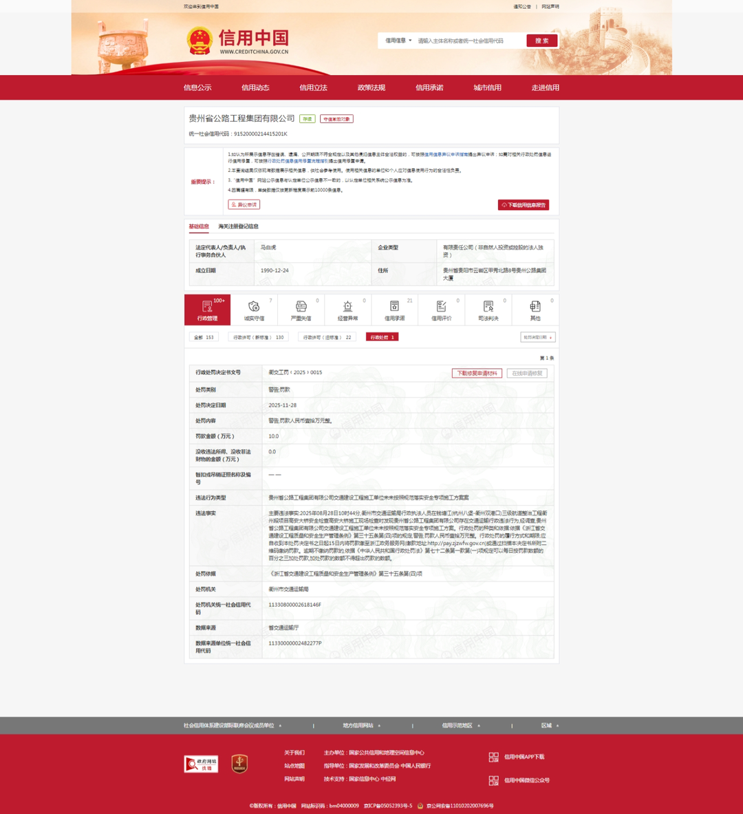 齐鲁晚报·齐鲁壹点记者于信用中国信用行政处罚栏获悉,11月28日,贵州交建集团旗下的贵州省公路工程集团有限公司(下称"贵州公路集团")收到罚 单,其违法行为类型是"交通建设工程施工单位未按照规范落实安全专项施工方案",处罚类别是"警告;罚款",处罚机关为衢州市交通运输局。 据贵州公路集团官网介绍,公司是贵州交通系统大型国有骨干企业,总资产近450亿元,年生产能力达300亿元。公司主要从事公路、桥梁、隧道建设等, 累计建成各种等级公路13400多公里、桥梁和隧道2400余座。 国家企业信用信息公示系统显示,贵州省公路工程集团有限公司成立于1990年,注册资本210300万元人民币,法定代表人马白虎,由贵州交通建设集团有 限公司全资持股。 内容显示,贵州公路集团的主要违法事实是,2025年8月28日10时44分,衢州市交通运输局行政执法人员在钱塘江(杭州八堡-衢州双港口)三级航道整治 工程衢州段项目高安大桥施工现场检查时发现,贵州公路集团存在交通运输行政违法行为,经调查,贵州公路集团作为交通建设工程施工单位未按照规范 落实安全专项施工方案。 对此,衢州市交通运输局依据《浙江省交通建设工程质量和安全生产管理条例》第 ...