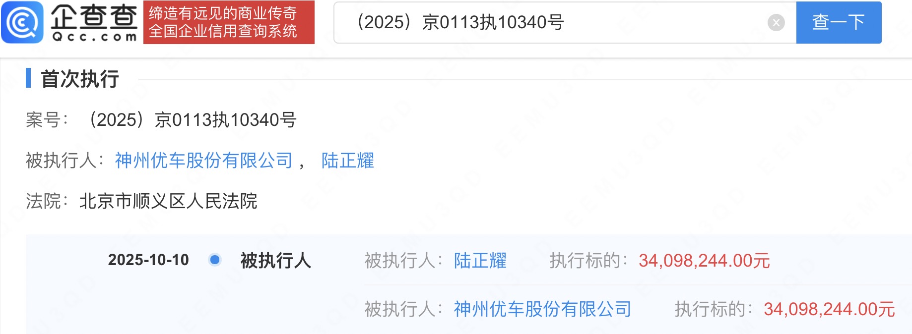 Core Points - Lu Zhengyao and Shenzhou Youche Co., Ltd. have recently been listed as defendants in a court case involving a guarantee contract dispute, with an execution amount exceeding 34.09 million yuan [1][5] - The case is being handled by the Beijing Shunyi District People's Court [1][5] Company Information - Shenzhou Youche Co., Ltd. is a joint venture company with a registered capital of approximately 2.69 billion yuan [4] - The company is currently operational and is involved in the network reservation taxi business, software technology development, and vehicle leasing [4] - Lu Zhengyao holds a 3.35% stake in the company, while the majority shareholder, Ye Dehao, owns approximately 77.68% [4][5] Legal and Financial Details - The execution amount in the case is specifically 34,098,244 yuan [5] - The case was filed on October 10, 2025, under the civil case number (2025) Jing 0113 Zhi 10340 [5] - The company has been restricted from high consumption and its shares have been frozen due to the legal proceedings [4][5]