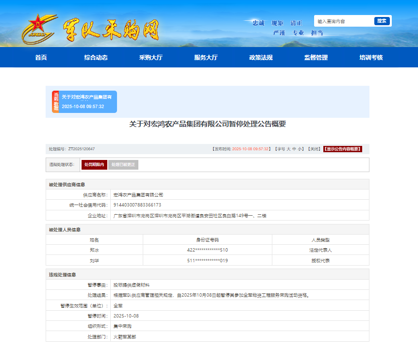 公开资料显示,宏鸿农产品始建于1997年,是一家集农产品种养、物流、销售、配送服务等业务为一体的综合性企业。深 圳市政府菜篮子重点工程项目、深圳市农业龙头企业,年销售达6亿!创业17年以来,公司始终秉承"忠诚信实、关爱健 康"的企业理念,坚持以市场为导向,不断探索发展的新思路。是目前深圳市最具竞争力和品牌影响力的农产品公司之 一。宏鸿集团公司旗下有平湖分公司、宝安分公司、广州分公司、上海分公司、东莞分公司、宏鸿健康食品有限公司、宏 鸿餐饮策划管理有限公司、鸿邦物流,正在筹建苏州分公司、珠海分公司以及佛山、番禺事业部等。 新闻爆料电话:0531-85196566 近日,火箭军某部根据军队供应商管理相关规定,对宏鸿农产品集团有限公司及其相关责任人员作出了暂停参加全军物资 工程服务采购活动资格的处理决定。 暂停处理公告显示,宏鸿农产品集团有限公司在参与军队采购活动投标过程中,存在提供虚假材料的违规行为。此举严重 违反了军队采购管理规定,破坏了公平竞争的市场环境。 根据军队供应商管理相关规定,火箭军某部决定对宏鸿农产品集团有限公司及其相关人员实施处理。自2025年10月8日 起,暂停宏鸿农产品集团有限公司参加全军范围 ...