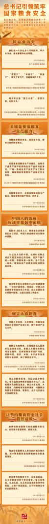 民以食为天。保障国家粮食安全是一个 永恒课题,习近平总书记念兹在兹。世 界粮食日之际,一起重温习近平总书记 重要论述。 我们是一个14亿多人口的国家,民以 食为天,首先要解决吃饭问题。 2023年4月10日 在广东考察时的讲话 民以食为 "菜篮子"、"米袋子"、"果盘 事关千家万户,是最基本的民生。 2023年1月18日 春节前夕视频连线看望慰问基层干部群众时的讲话 书记引领筑 家粮食 E 粮食安全是"国之大者"。悠悠万 事,吃饭为大。 2022年3月6日 在参加全国政协十三届五次会议的农业界、社会福利 和社会保障界委员联组会时的讲话 键是要保粮食 保障国家粮食安全,是农业大省、粮 食大省的政治责任。 2025年2月8日 在听取吉林省委和省政府工作汇报时的讲话 高质量推进粮食生产功能区、重要农 产品生产保护区和特色农产品优势区建 设,打造一批绿色农产品生产加工供应 基地,确保粮食等重要农产品稳定安全 供给。 2024年3月20日 在主持召开新时代推动中部地区崛起座谈会时的讲话 保障粮食安全,关键是要保粮食生产 能力,确保需要时能产得出、供得上。 我国有14亿多人口,粮食安全必须靠 我们自己保证,中国人的饭碗应 ...