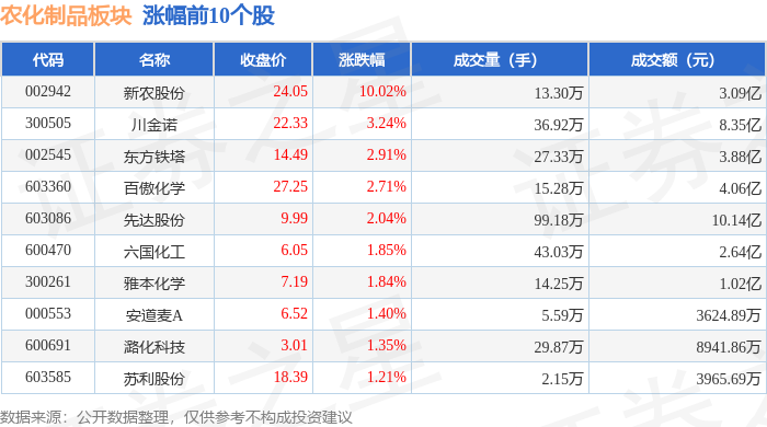 | 代码 | 名称 | 收盘价 | 涨跌幅 | 成交量(手) | 成交额(元) | | --- | --- | --- | --- | --- | --- | | 002513 | 蓝丰生化 | 8.50 | -8.21% | 139.41万 | 12.66亿 | | 603360 | 百傲化学 | 26.53 | -5.11% | 21.65万 | 5.92亿 | | 600426 | 华鲁恒升 | 25.50 | -4.14% | 21.59万 | 5.56亿 | | 600596 | 新安股份 | 10.50 | -3.31% | 19.44万 | 2.07亿 | | 600141 | 兴发集团 | 29.23 | -2.99% | 24.15万 | 7.25 Z | | 600486 | 扬农化工 | 68.70 | -2.88% | 4.14万 | 2.87亿 | | 600691 | 路化科技 | 2.97 | -1.98% | 37.38万 | 1.12亿 | | 600331 | 宏达股份 | 10.21 | -1.92% | 45.28万 | 4.70亿 | | 000422 | 湖北宣化 ...