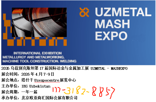UZMETAL - MASHEXPO 展会时间:2026年4月7-9日 2026乌兹别克斯坦第17届国际冶金与金属加工展 文君 欧亚商汇 文君 一.展会介绍 2026年,全球冶金与金属加工行业的目光将聚焦于中亚地区,一场盛大的行业盛会——第 17届乌兹别克斯坦冶金、金属加工及机床、焊接展览会(Uz Metal Mash Expo)即将在乌兹别克斯坦首 都塔什干展览中心拉开帷幕。这场展会定于2026年4月7日至9日举行,由IEG展览公司主办,自2008年 起每年一届,已成为中亚地区影响力的冶金与金属加工行业盛会。 Uz Metal Mash Expo展会面积达到 10,000平方米,预计吸引超过19,471名专业观众和15个国家和地区的200家参展商及品牌参展。展会地点 位于乌兹别克斯坦塔什干市,交通便利,设施完善。展会不仅得到了乌兹别克斯坦地质与矿产资源委员 会的大力支持,还凭借其独特的地理位置和行业影响力,吸引了全球范围内的参展商和观众。 同期行 业盛会: 乌兹别克斯坦矿山机械工程机械展览会 Uz Mining Expo 乌兹别克斯坦安防展览会 Uz Secure Expo 乌兹别克斯坦化工展览会 Uz C ...