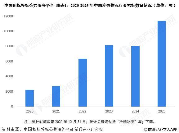 食品冷链物流业务总需求量逐年递增 农产品产量稳增叠加消费升级,中央厨房、生鲜电商、即时零售等新业态兴起,激活冷链物流市场需 求,2024年我国食品冷链物流业务总需求量为3.65亿吨,同比增长4.3%。 行业主要上市公司:顺丰控股(002352.SZ)、京东集团-SW(09618.HK)、广汇物流(600603.SH)、獐子岛 (002069.SZ)、海容冷链(603187.SH) 行业招标数量总体增加 根据中国招标投标公共平台披露的数据显示,2020-2025年中国冷链物流行业招标数量总体上涨,2025 年超过11000项,为近年来最高值。 注:统计时间截至2025年12月31日;统计关键词包括"冷链物流"等;下同。 预计到2030年中国冷链物流行业市场规模超过6700亿元 我国重视冷链物流行业发展,但受限于投入成本高,基建建设时间长以及盈利水平较低等因素影响,行 业市场规模增长速度较慢,前瞻预计2030年中国冷链物流行业市场规模约为6783亿元,5年间CAGR约 为4%左右。 截至2025年,国有企业招标数量占比为47%,高于其余招采单位类型,事业单位和党政机关招标数量占 比为17%和15%左右,分别排名第 ...