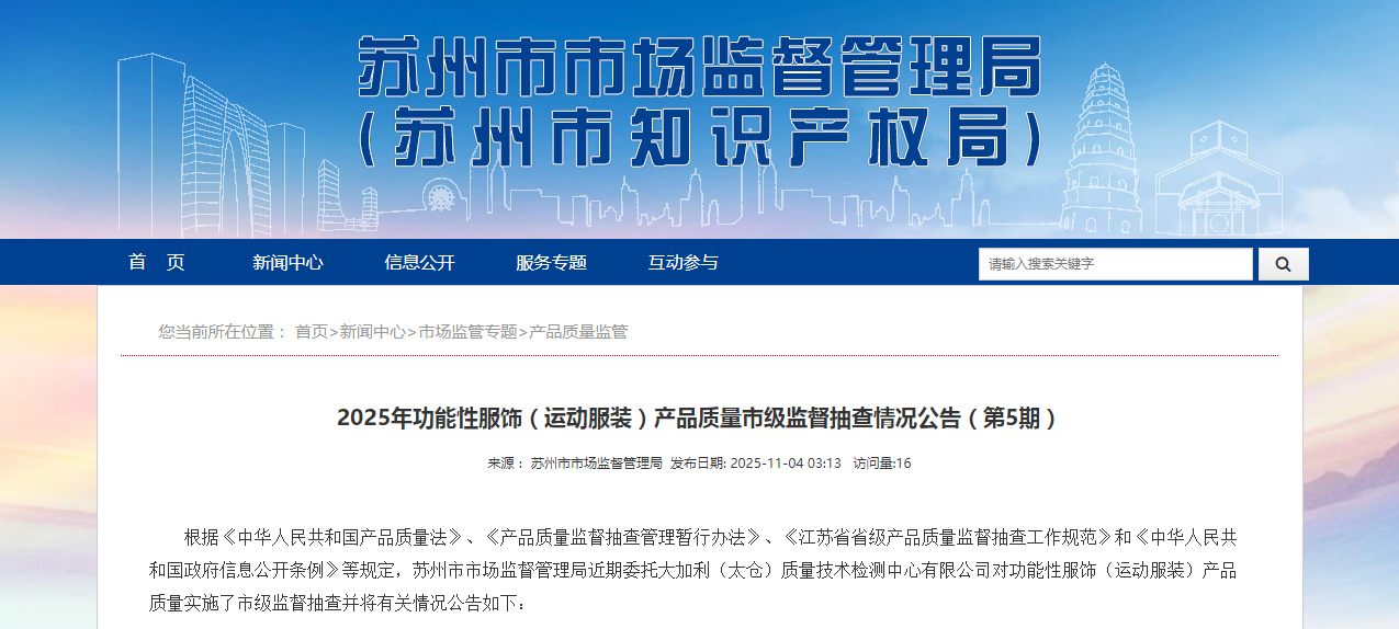 江苏省苏州市市场监管局发布2025年功能性服饰(运动服装)产品质量市级监督抽查情况公告(第5期)