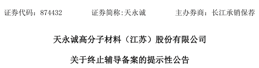 2023年10月30日,天永诚与长江承销保荐签订上市辅导协议,并向江苏证监局提交了首次公开发行股票并在创业板上市辅 导备案材料。 天永诚2010年成立,主要从事高性能封装、导热材料的研发、生产和销售,主要产品包括有机硅密封胶、有机硅灌封胶等 封装材料以及导热凝胶、导热粘接胶、导热硅脂、高导热灌封胶等导热材料,产品广泛应用于光伏发电、新型储能、新能 源汽车、电子电气等领域。 10月9日,新三板挂牌公司天永诚(874432)公告披露,综合考虑公司发展战略、当前资本市场环境和政策等诸多因素,经 与长江承销保荐友好协商,双方于2025年9月25日签署了《天永诚高分子材料(江苏)股份有限公司与长江证券承销保荐有 限公司之首次公开发行股票并上市辅导终止协议书》,长江承销保荐于2025年9月26日向江苏证监局报送了终止辅导备案的 申请材料,江苏证监局于2025年9月29日确认公司终止辅导。 | | 业务类别 | 封装、导热材料 | | | | | --- | --- | --- | --- | --- | --- | | 序号 | 客户名称 | 是否关联 方 | 销售内容 | 金额 | 占营业收入比例 | | 1 | 晶澳 ...