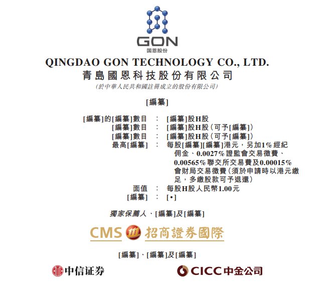 据港交所1月14日披露,青岛国恩科技股份有限公司(002768.SZ)通过港交所主板上市聆讯,招商证券国 际为独家保荐人。据招股书,国恩股份是一家专注于化工新材料及明胶、胶原蛋白上下游产品的中国供 应商。 | 編纂]的[編纂]數目 | .. | [編纂]股H股 | | --- | --- | --- | | [編纂]數目 | . | [編纂]股H股(可予[編纂]) | | [編纂]數目 | . | [編纂]股H股(可予[編纂]) | | 最高 編纂] | . | 每股[編纂][編纂]港元,另加1%經紀 | | | | 佣金、0.0027%證監會交易徵費· | | | | 0.00565%聯交所交易費及0.00015% | | | | 會財局交易徵費(須於申請時以港元繳 | | | | 足,多繳股款可予退還) | | 面值 | .. | 每股H股人民幣1.00元 | | [繼續] | : [·] | | 在大健康行业领域,国恩股份聚焦天然胶原产业,向下纵向延伸产业链。该公司的主要子公司东宝生物 拥有几十年的悠久历史,依托从胶原到"胶原+"纵向一体化发展战略,已成功建立起覆盖胶原蛋白肽类 ╱衍生原料到终端产品的产 ...