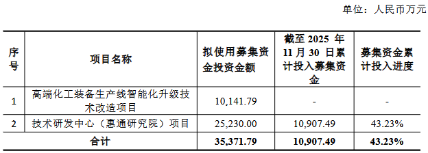| | | | 截至 2025 年 | | | --- | --- | --- | --- | --- | | 府号 | 项目名称 | 拟使用募集资 金投资金额 | 11 月 30 日累 计投入募集资 | 募集资金紧 计投入讲度 | | | | | # | | | 1 | 高端化工装备生产线智能化升级技 术改造项目 | 10.141.79 | | | | 2 | 技术研发中心(惠通研究院)项目 | 25,230.00 | 10.907.49 | 43.23% | | | 合计 | 35,371.79 | 10.907.49 | 43.23% | 中国经济网北京1月9日讯 惠通科技(301601.SZ)近日披露《关于募集资金投资项目延期的公告》。 公司于2026年1月5日召开第四届董事会第五次会议,审议通过了《关于募集资金投资项目延期的议 案》,同意对"高端化工装备生产线智能化升级技术改造项目"和"技术研发中心(惠通研究院)项目"达 到预计可使用状态的时间延期至2026年12月31日。 本次募投项目延期不涉及变更募集资金的用途,在董事会审批权限内,无需提交股东会审议。 公告称,自募集资金到位以来,公司积极推进募 ...