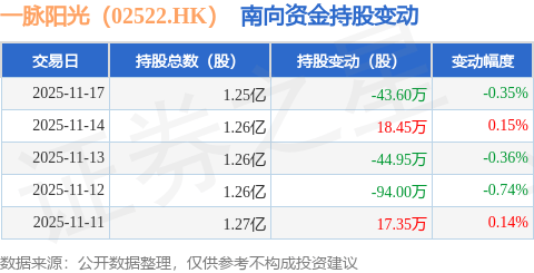 一脉阳光(02522.HK):11月17日南向资金减持43.6万股