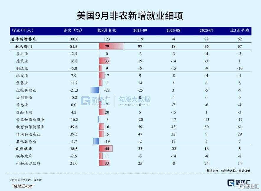 以下文章来源于格隆 ,作者万连山 格隆 . 一个游走于资本市场与佛祖之间的浪子。我可以生,可以死,我大笑,由天决定! 本文来自微信公众号: 格隆 ,作者:万连山,原文标题:《脆弱的繁荣》,题图来自:视觉中国 迟到了整整48天后,原本应于10月3日公布的美国9月非农报告,终于出炉了。 至少表面上看,数据非常强劲。 新增就业人数11.9万,较预期的5.1万人翻倍,更远高于达拉斯联储估算的3万人/月就业平衡水平。 这份数据直接打破了市场对12月美联储立即降息的普遍幻想,也是美股在当天高开低走的主要因 素。 但态度的转变,并不坚决。 | 行业(千人) | 占比 (%) | | 棱8月变化 | 2025-09 | 2025-08 | 2025-07 | 近3月平均 | | --- | --- | --- | --- | --- | --- | --- | --- | | 总体新增非农 | 100.0 | | 123 | 119 | -4 | 72 | 62 | | 私人部门 | 81.5 | | 79 | 97 | 18 | ર્સ | 57 | | 采矿业 | -2.5 | | 0 | -3 | -3 | -4 | ...