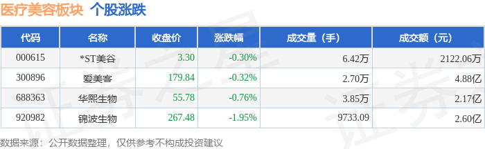 证券之星消息,10月10日医疗美容板块较上一交易日下跌0.5%,锦波生物领跌。当日上证指数报收于 3897.03,下跌0.94%。深证成指报收于13355.42,下跌2.7%。医疗美容板块个股涨跌见下表: | 代码 | | | 名称 | | | | | --- | --- | --- | --- | --- | --- | --- | | 300896 爱美客 | 1905.34万 | 3.90% | -1173.79万 | -2.40% | -731.55万 | -1.50% | | 000615 *ST美谷 | -116.92万 | -5.51% | -150.21万 | -7.08% | 267.12万 | 12.59% | | 688363 华熙生物 | -372.04万 | -1.72% | 792.57万 | 3.66% | -420.53万 | -1.94% | 以上内容为证券之星据公开信息整理,由AI算法生成(网信算备310104345710301240019号),不构成投资建议。 | 代码 | 名称 | 收盘价 | 涨跌幅 | 成交量(手) | 成交额(元) | | | --- | --- ...